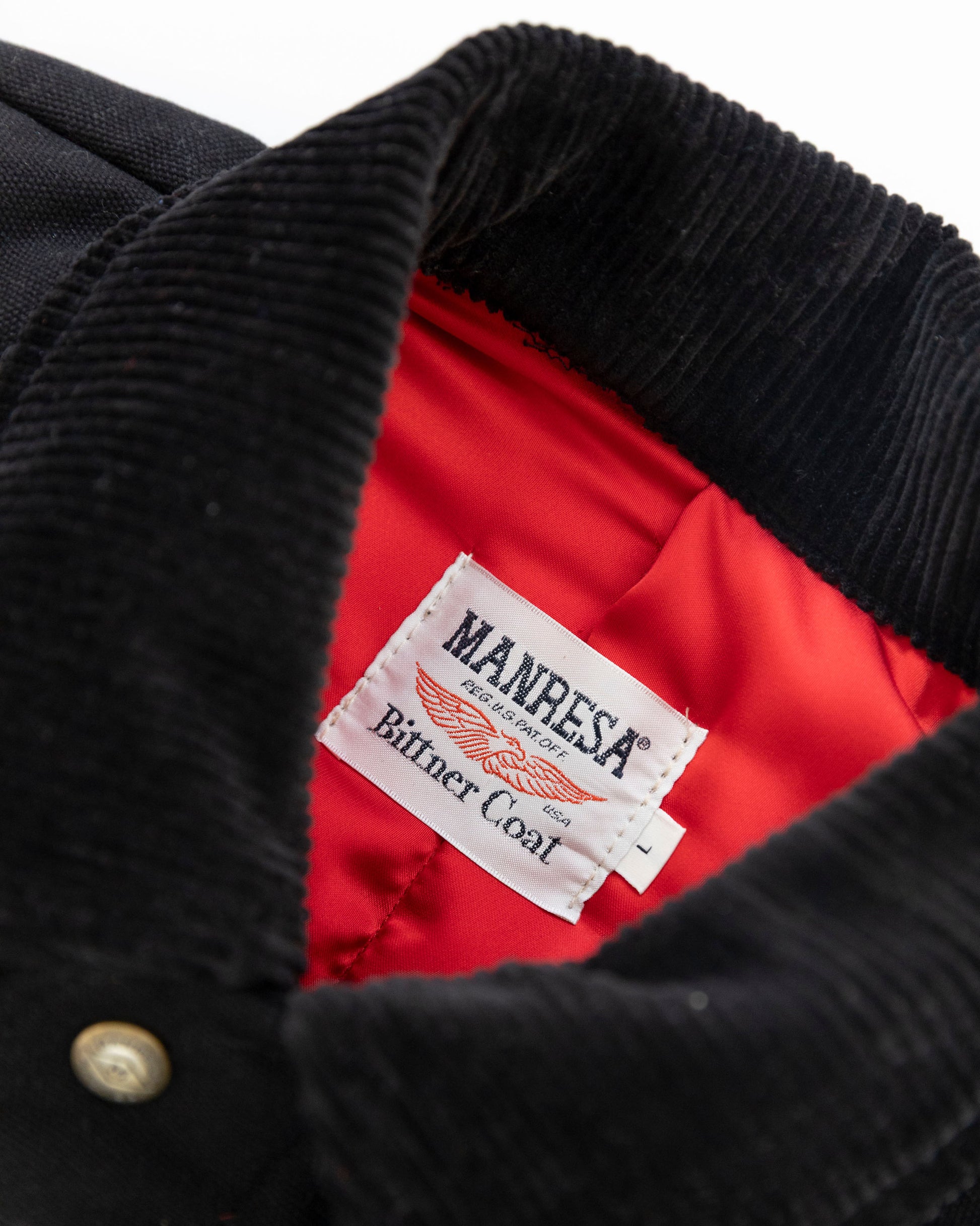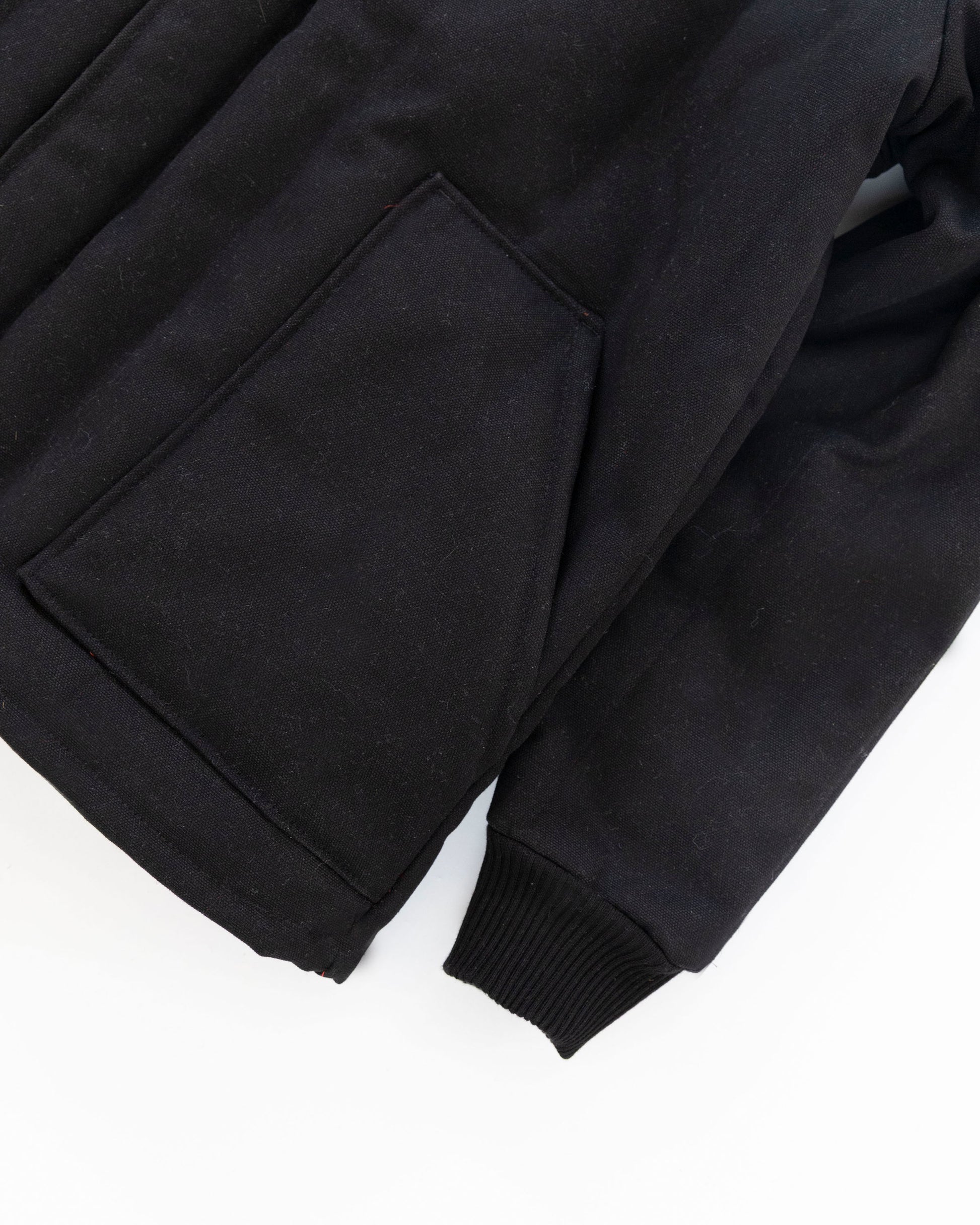 19 oz. cotton canvas. 5 oz double faced satin lining. Japanese corduroy collar. 2 way YKK zipper. Custom knit 100% cotton ribbed cuffs. 5 oz. Climashield APEX insulation rated to withstand temps down below freezing. Oh, and one of the sickest shuttle loomed labels we've ever made.