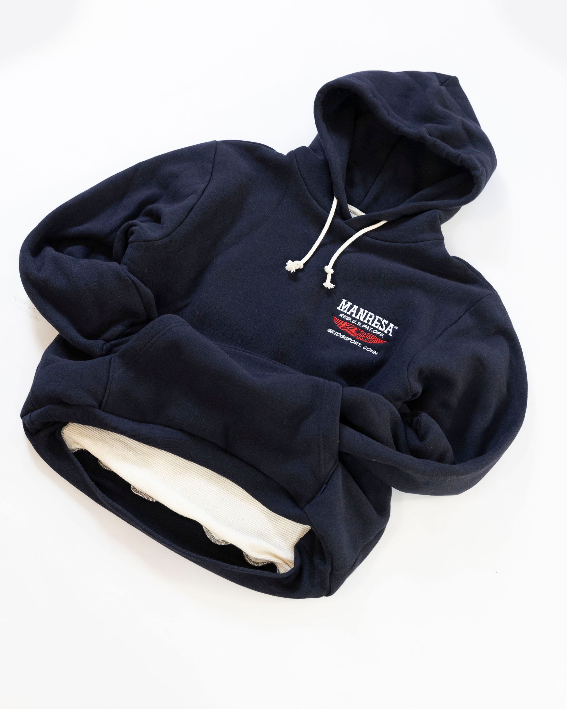 Camber rules. We love Camber. We're standing on there shoulders a bit here. 100% heavyweight cotton fleece, lined in undyed cotton thermal, with a generous fit. The weight on this is impressive. Made by the fine folks at Softgoods Detroit, exclusively for Manresa Clothing.